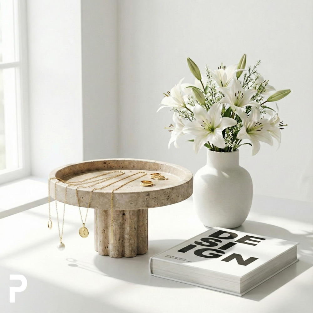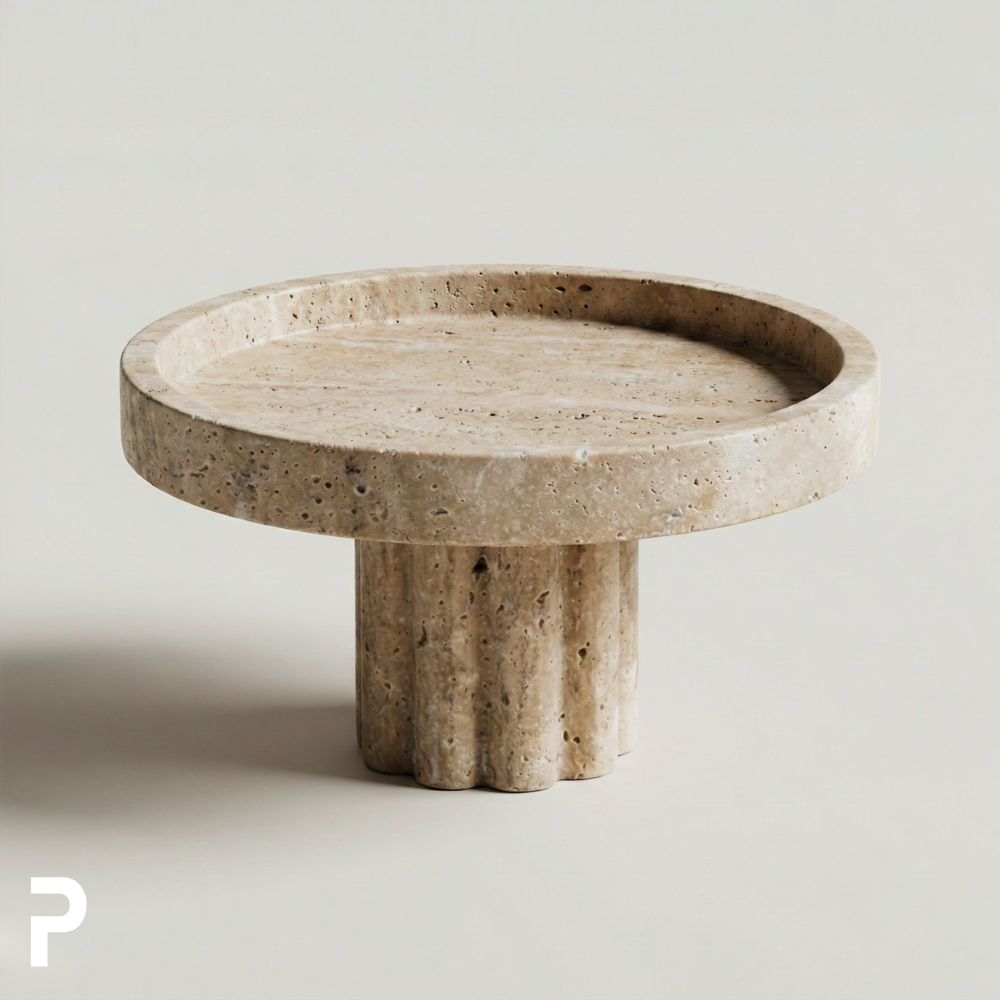 Doğal travertenin mimari zarafetinden ilham alan Columna Traverten Stand, sütun formundaki heykelsi ayağı ve geniş yüzeyiyle hem modern hem de klasik çizgileri bir araya getiriyor. Üst bölümdeki ince çerçeve detayı, ürüne hem derinlik hem de işlevsel bir duruş kazandırıyor.