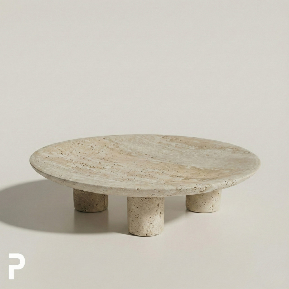 Tripod Traverten Stand; meyve, servis, dekor ve mum yerleşimleri için ideal bir tamamlayıcı üründür. Doğal taşın sıcak dokusunu modern tasarımla buluşturarak her ortama doğal bir zarafet katar.